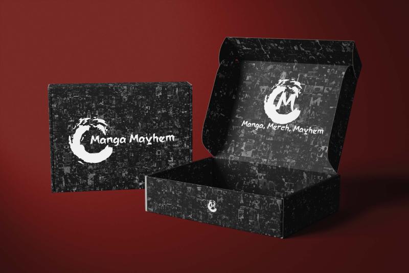 Here I created a potential subscription box and put them into mockups. I named my box Manga Mayhem, which sells Manga and Merch for fans. The slogan is Manga, Merch, Mayhem, which you can see in the open mockup! The logo, as well as the pattern, embodies the name and purpose of the box.